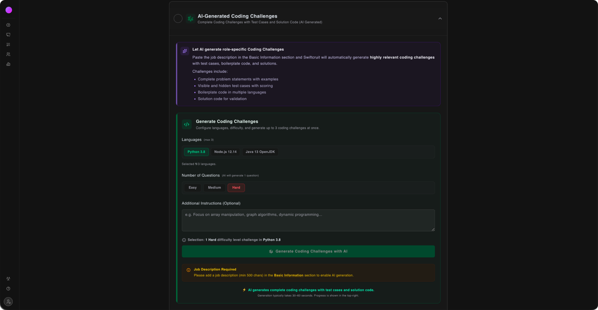 Recruiters simply provide a job description and a few optional instructions. The platform then automatically generates highly relevant questions designed specifically for the role.