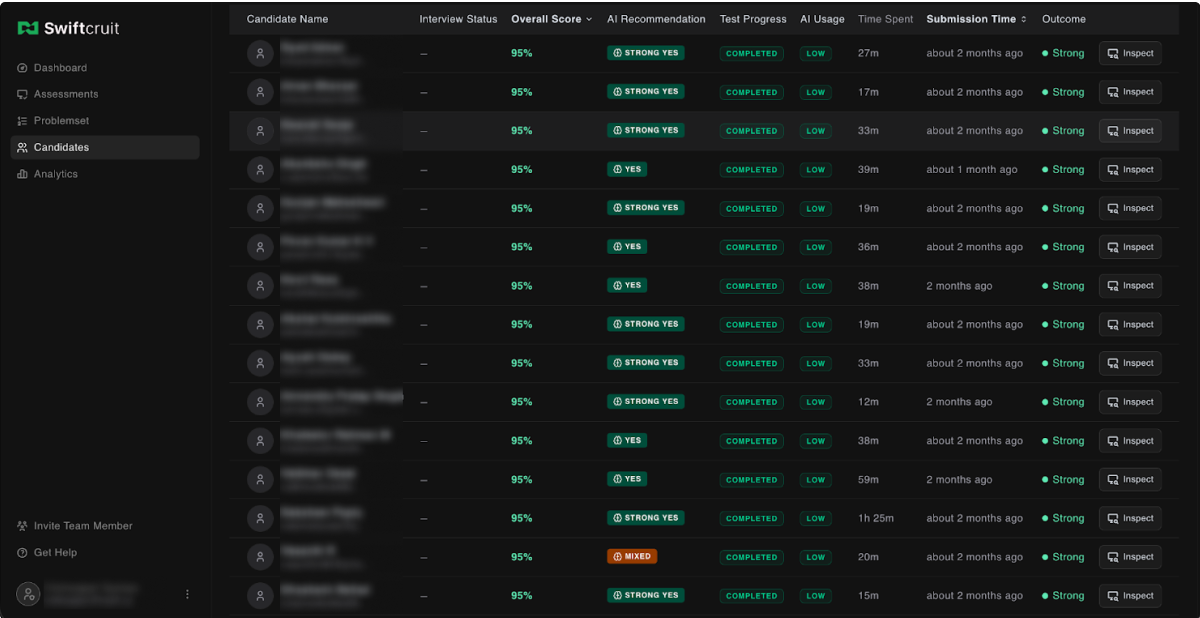 These signals are generated through deep analysis of candidate performance across multiple dimensions. Recruiters can instantly identify the most promising candidates without reviewing every code submission.