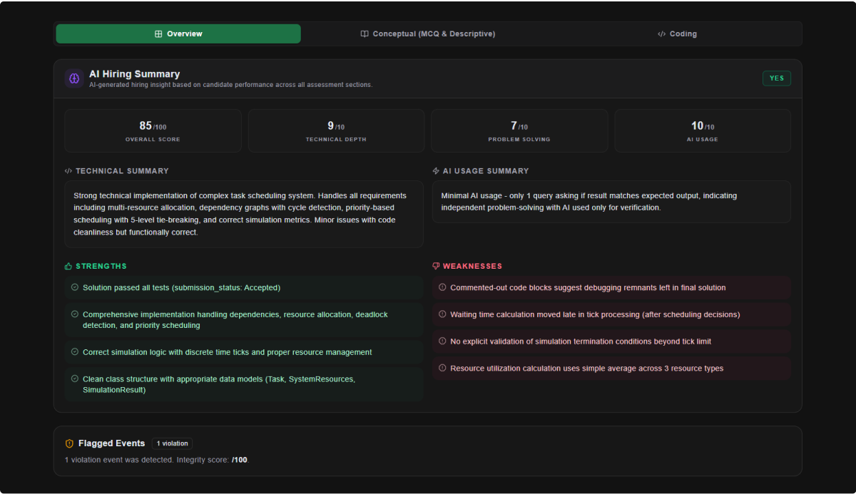 Instead of reviewing hundreds of lines of code manually, hiring teams receive structured insights into the candidate’s performance.